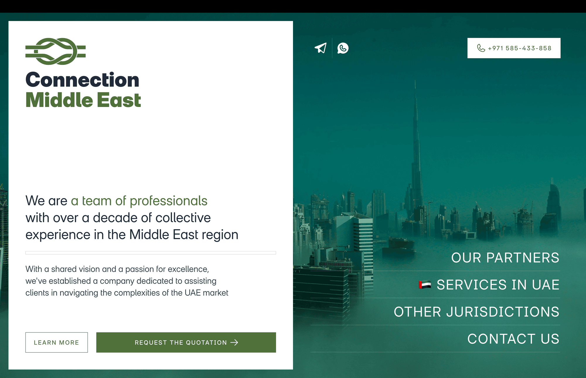 Этот сайт — не просто визитка юридической или консалтинговой фирмы, а настоящий цифровой портал для тех, кто хочет успешно войти в рынок ОАЭ и развивать бизнес в регионе. Connection Middle East — команда профессионалов с опытом работы на Ближнем Востоке более десяти лет, и сайт отражает их философию: чётко, понятно, современно и дружелюбно к пользователю. Благодаря чистому и стильному дизайну на Framer, сайт сразу даёт ощущение уверенности и динамики, которую хотят видеть клиенты, планирующие расширяться или инвестировать в регионе.