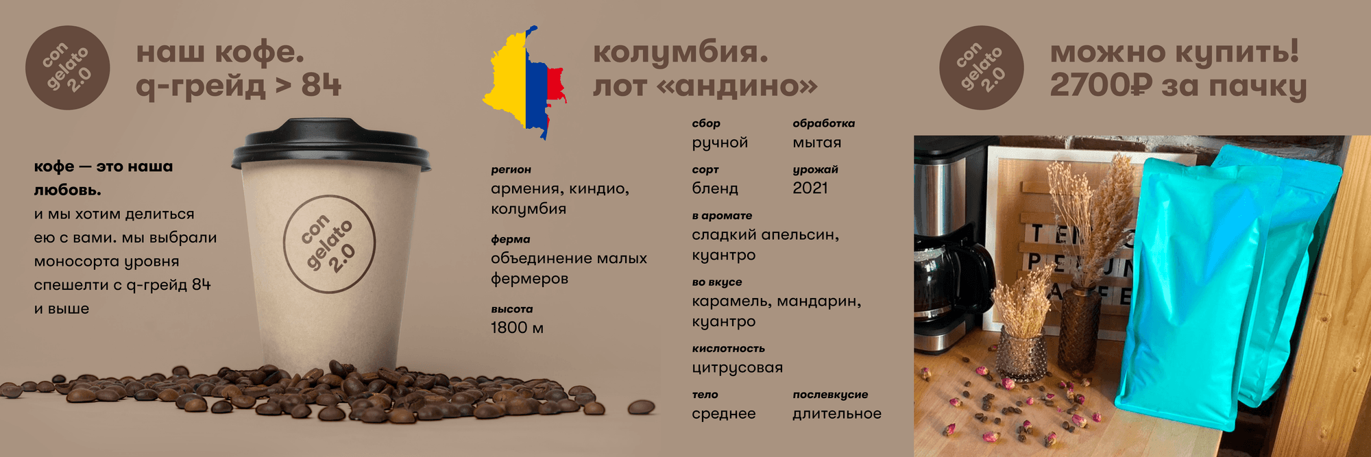 У нас совершенно потрясающий кофе с Q-grade > 84! Вот на этой картинке ниже все и написано про кофе «Колумбия», лот «Андино».